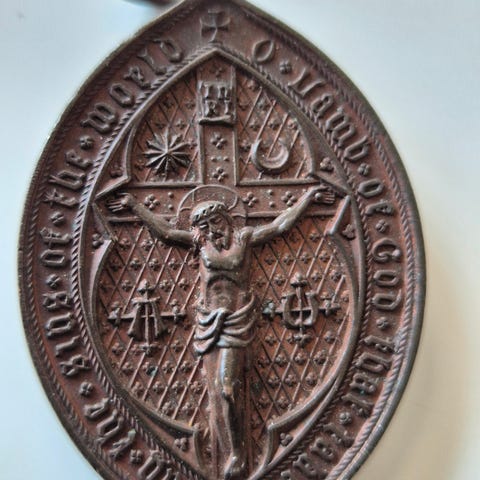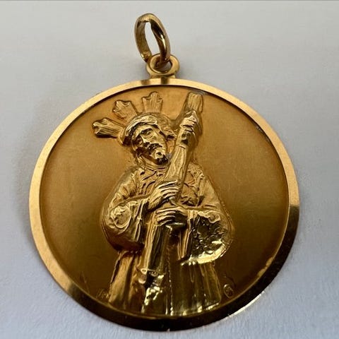 Mirakelmedaljen Vor Frue af Nåde, tegnet ud fra visionen af Sankt Katarina Labouré, lavet i guld 19,2k, vægt 4,5 gram, et stykke meget efterspurgt af samlere.