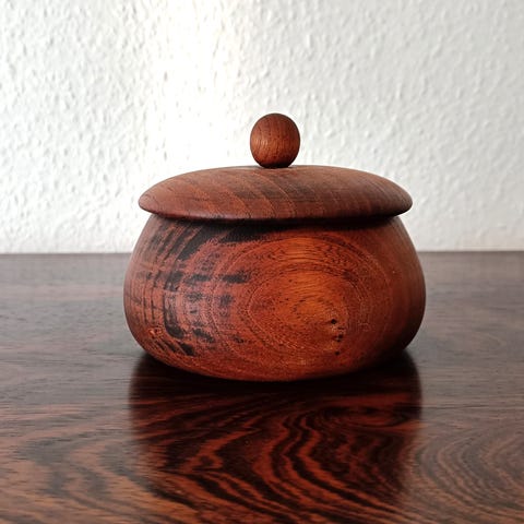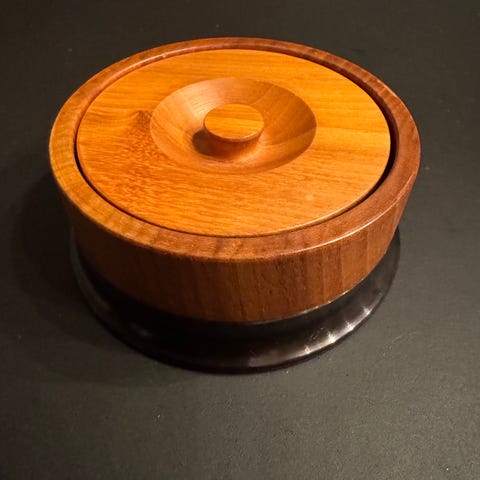 Sælger denne fine, runde opbevaringsdåse i lyst bambustræ. Dåsen har aldrig været brugt og fremstår som ny.