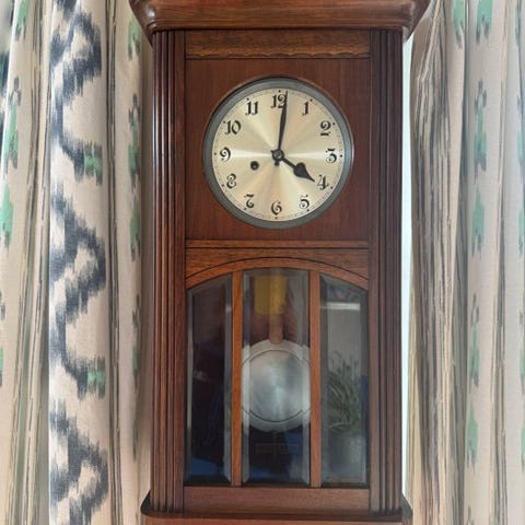Mauthe Art Déco vægur, Tyskland 1930–1940, mekanisk urværk med flere dages gangreserve, kvartkridtsklage med flere klokker og gong, træ og messing, 60 × 30 × 25 cm, 10 kg. Klik på den blå "gå til varen" knap, for at købe eller byde på denne vare. Den samlede pris vil blive vist inden du afgiver dit bud.