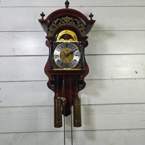 Et pragtfuldt pendulur-ur, gammelt, i kolonial stil og oprindelse. Det er på et tidspunkt blevet gennemgået grundigt og kalibreret. Når det sættes op på væggen, skal det kalibreres, men det fungerer fuldt ud og giver en pragtfuld klang. Det bør helt sikkert smøres og genkalibreres. For samlere er det virkelig fascinerende. Hvis det skulle blive købt, ville det blive emballeret og mekanismerne sikret med alle nødvendige forholdsregler, absolut beskyttet i en ultra-sikker emballage. Denne part vil blive sendt med anbefalet post, eller kan afhentes i Rom.