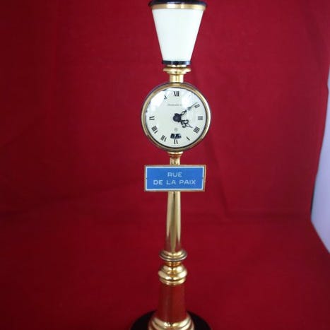 En seks‑dages mekanisk bordurur af Jaeger-LeCoultre i form af en gammel gadelygte, model “Wall Street”, lavet af forgyldt metal, 1960–1970, produceret i Schweiz, ikke slagende og i funktion. Klik på den blå "gå til varen" knap, for at købe eller byde på denne vare. Den samlede pris vil blive vist inden du afgiver dit bud.