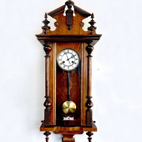 Denne elegante vægur er et klassisk samlerobjekt, identificeret som en regulator fra det prestigefyldte tyske mærke Junghans. Dens robuste og nøgterne design er karakteristisk for stilen fra begyndelsen af det 20. århundrede, sandsynligvis dateret mellem 1910 og 1930.