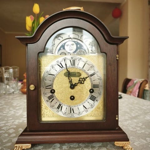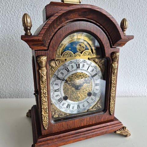 Tempus Fugit vægur fra 1970–1980, af træ med messingdele, mekanisk urværk med otte dages gangreserve og Westminster slag med kvart over på fem gonger, lavet i Tyskland. Klik på den blå "gå til varen" knap, for at købe eller byde på denne vare. Den samlede pris vil blive vist inden du afgiver dit bud.