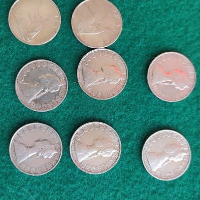 Et sæt med 21 italienske sølvmønter fra 1960 (Caravelle-design), sølv 835/1000, samlet vægt 231 g, stand ugraderet. Klik på den blå "gå til varen" knap, for at købe eller byde på denne vare. Den samlede pris vil blive vist inden du afgiver dit bud.