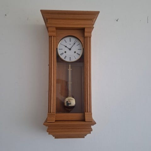 Bénodet Ginistère vægur 1960’erne med oval trækasse, messingvægte, mekanisk urværk med 8 dages gangreserve, oprindelse Frankrig, i god stand og i funktion, halvtime slag på flere klokker. Klik på den blå "gå til varen" knap, for at købe eller byde på denne vare. Den samlede pris vil blive vist inden du afgiver dit bud.
