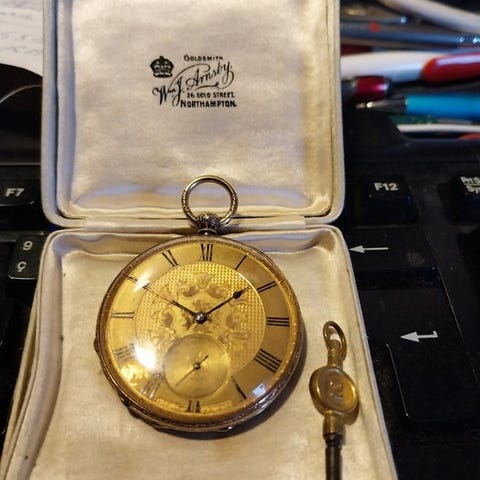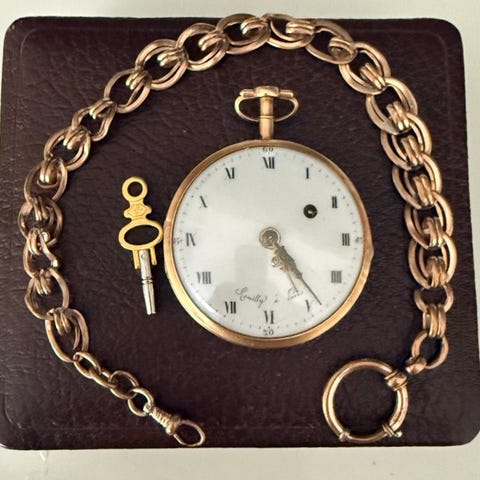 Dette er et klassisk gyldent lommeur fra slutningen af 1800-tallet (sandsynligvis mellem 1880 og 1900). Uret har et meget overdådigt udseende takket være den udsmykkede skive og