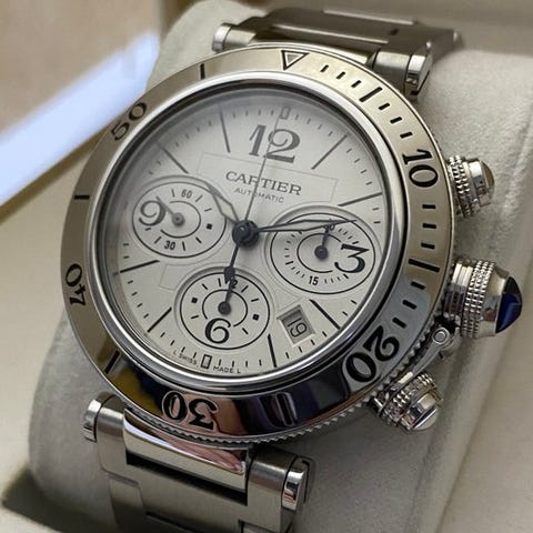 Cartier Pasha C herreur unisex fra 1998, reference 2324, automatisk Cartier 049 bevægelse, rustfrit stålhus og -armbånd, diameter 35 mm, hvid urskive, commemorative udgave til Iván Pérez Muñoz efter sejren i Ligue Cup i Frankrig 1998–99, i meget god stand uden original boks eller papirer, med ægthedscertifikat og forsikret forsendelse. Klik på den blå "gå til varen" knap, for at købe eller byde på denne vare. Den samlede pris vil blive vist inden du afgiver dit bud.