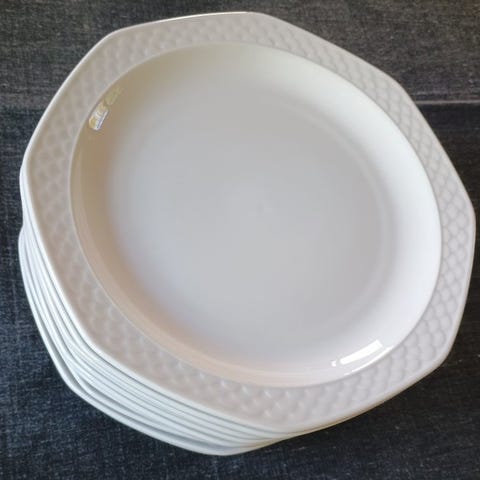 12 flade tallerkener, hvoraf et er erstatning