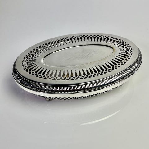 Designet har en stilfuld ottenkantet kant og fint perforerede dekorative motiver, typisk for raffineret fransk bordservice fra midten af det 20. århundrede. De rene linjer og elegante proportioner gør den velegnet til både klassiske og moderne borddækninger.