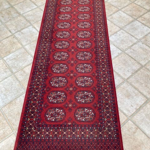 Afghansk tæppe, 290 × 80 cm, uld på bomuld, rød, fra slutningen af det 20. århundrede, i god, overhældet tilstand, vægt 8 kg. Klik på den blå "gå til varen" knap, for at købe eller byde på denne vare. Den samlede pris vil blive vist inden du afgiver dit bud.