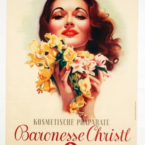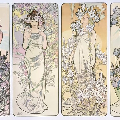 I beskrivelsen forekommer signaturen Alphonse Mucha, en af de førende eksponenter for Art Nouveau, hvis stil her fuldt ud bliver fremkaldt i de