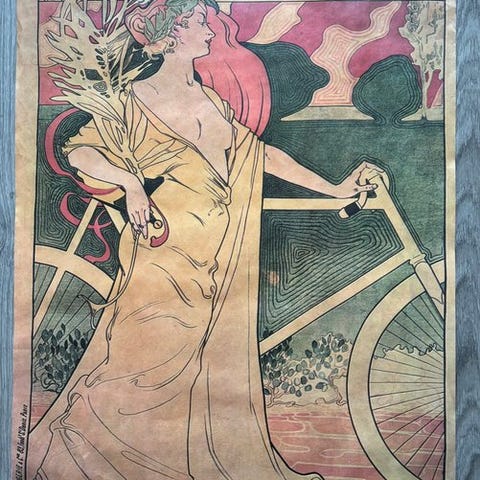 Smukt reklame-manifest for “Waverley Cycles”, et raffineret eksempel på Liberty/Art Nouveau-stilen med en ikonisk kvindefigur i bølgende og dekorative linjer, indlejret i en typisk fin de siècle-komposition.
