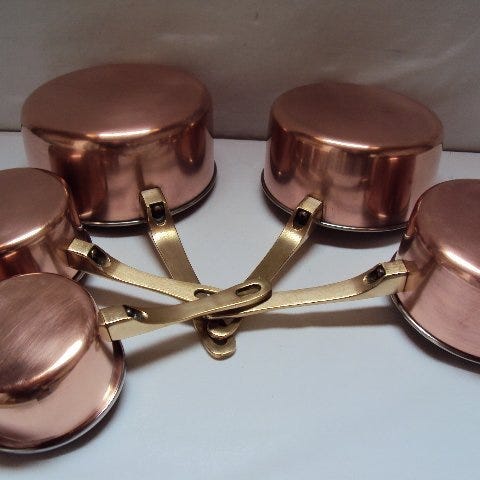 Een degelijke set van 5 Franse pannen, 4,11 kilo - Pande - kobber, støbejern