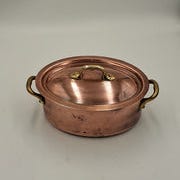 Vidunderlig fransk kobbergryde af fremstilling stemplet « Les métaux ouvrés de VESOUL » med oprindeligt låg og håndtag i messing.