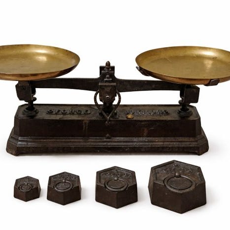 Ældre vægt, 5 kg, af fransk oprindelse, fra 1930–1950, med kobberskåle og en måleindikator i form af en lyre. I original stand, ikke restaureret. Fra privat samling.