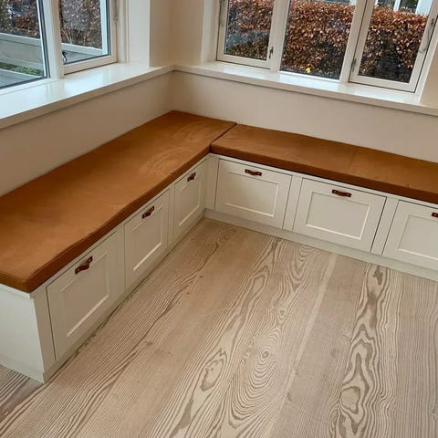 Vi laver også hynder i moderne møbelstoffer og læder lavet på mål så de passer til bænken.