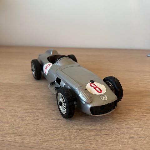 Fin lille VW Bobbel modelbil i grå med sølvfarvede detaljer. Har åbne vinduer, sorte sæder og ruller fint på hjulene.