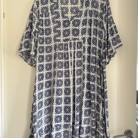 Her er en fin hvid romantisk og feminin kjole med et sort mønster, blonde kanter, elastik rundt om ryg og bryst (smocksyning) og et bindebånd.