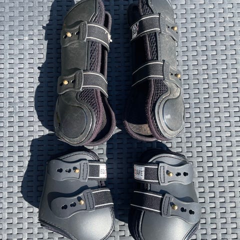 Veredus Carbon Gel bagbens gamacher i sort med kraftig forstærkning foran. Lukkes med dobbelt gummirem med flere huller, og har blødt indvendigt materiale mod benet. Brugt men i fin stand