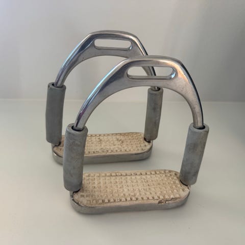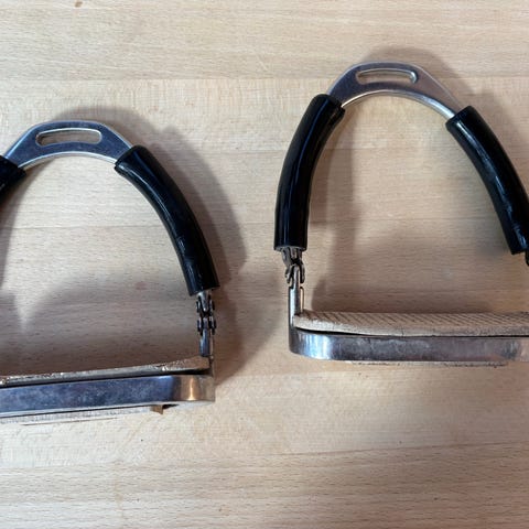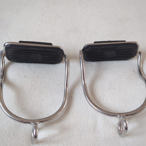 Sprenger junior stigbøjler med gummibelægning og brede trædeflader. Har bevægelige sider med gummi og skridsikre sorte indlæg. Der medfølger poser til stigbøjlerne