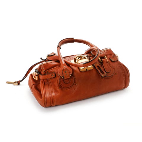 Lækker brun Chloé håndtaske i læder med kraftige hank og store guldfarvede spænder. Har hængelås-detalje foran og flere små metalnitter som pynt.