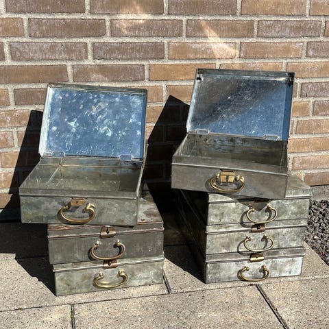 Fede, rustikke og originale bank-kassetter fra bankboks. Zink med masser af patina. Super dekorative og unikke. Bunken med 4 ens måler 28x9x43,5 cm - pris pr. stk. kr. 110. Alle 4 sælges samlet for kr. 400 (fast pris). Skal afhentes i Børkop (sender ikke).