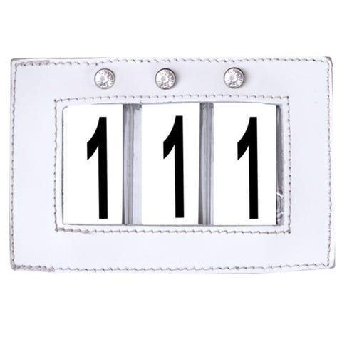 Rundt stævnenummer med alle numre og snor, der kan spændes om trensen eller grime. Har åbning bagpå til at skifte nummeret ud.