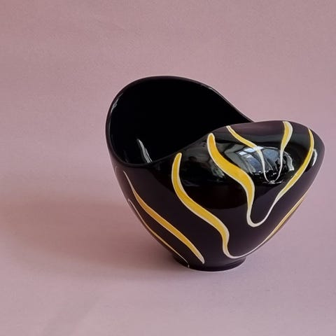 Skøn gul flødekande af keramik. Hvid inderside. Sort kant.