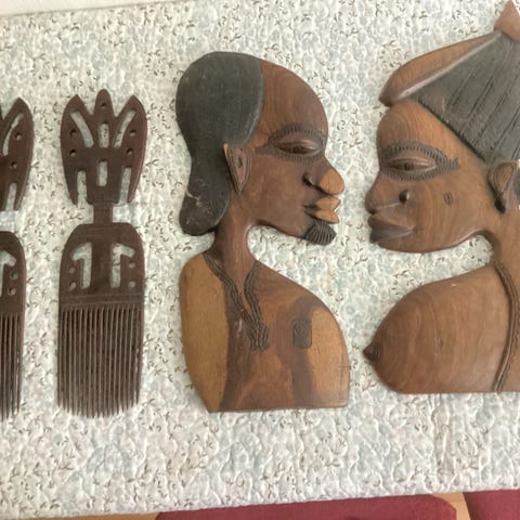 Sæt med to udskårne afrikanske træmasker til ophæng på væg. Flotte udskæringer og mønstre i mørkt og lysere træ, begge med hul til ophæng på bagsiden.