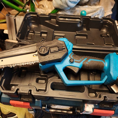 Elektrisk kædesav i grøn/sort med håndtag for og bag. Har kæde med sværdbeskytter og betjeningsknapper på siden.