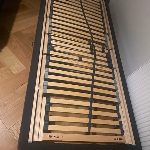 Kvalitets seng fra May Flower. Bemærk at sengebunden IKKE er de sædvandlige træ lamelbund men en god metal bund, Hertil en tyk god madras. En virkelig god comfort med en flot sengeramme i bøg. Og naturligvis er det en elevationsseng, motor til seng må du selv købe. Mål 90 X 200, H 52.