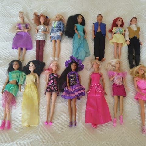 OBS! Storesøster og Lillebror, Aladdin, Jasmine og Pocahontas inkl. tilbehør er SOLGT samt blå/turkis kjole længst nede i venstre hjørne på hende, der mangler ben er SOLGT.