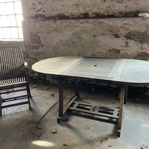 Sæt med havebord i massiv træ og 6 matchende træstole med armlæn. Der følger blå sæde- og nakkepuder med til stolene, og bordet har lameller på bordpladen. Har altid været vedligeholdt med træolie.