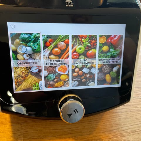 multicooker/køkkenmaskine med stor skål i rustfrit stål og låg med håndtag. Har frontbetjent drejeknap, stor touchskærm og tilhørende dampindsats i plast.