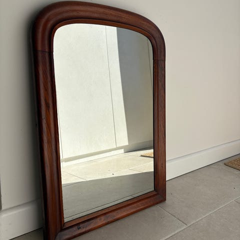 Fint spejl med træramme og dekorative udskæringer foroven. Kan stå op ad væggen eller hænges op efter eget ønske.