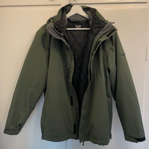 Vinterjakke, str. S, Truenorth Aquatex Softshell, Mørk grøn, Polyester, Næsten som ny, Varm vandtæt vinterjakke med aftagelig hætte og 3 inderlommer. Står stort set som ny, hvor kun lynlås “dimsen” har tabt lidt farve. Brugt meget lidt, da jeg har foretrukket en dunvinterjakke. Nypris var 2.000 kr i en friluftsforretning. Ny pris