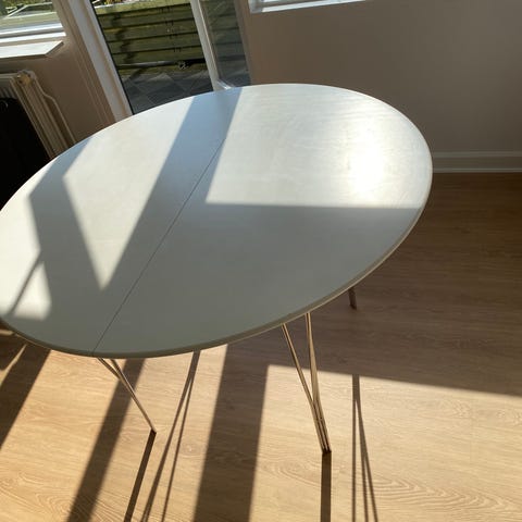 Bordet er malet, men har brugsspor efter livet med to børn. Ingen dybe huller eller lignende. Det er fra et røg- og dyrefrit hjem.