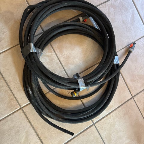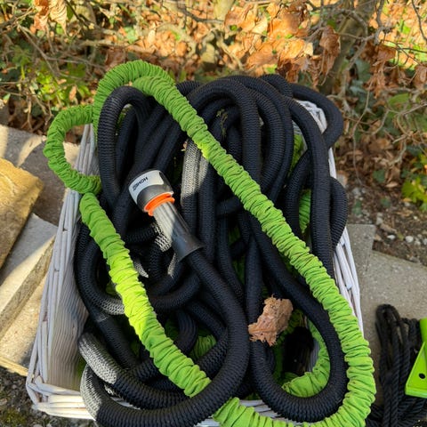 Grøn havevandslange med koblinger i begge ender. Let at rulle ud og samle igen til vanding i haven. Der er tale om Gardena sivslange af den flade type. To stykke a 15 m.