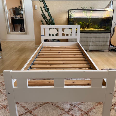 Fin juniorseng fra IKEA 70x 160 cm i hvid med udskårne får i gavlene. Trælameller medfølger i rammen, klar til madras efter eget valg (hvis i ønsker madras kan det evt aftales også - vi har en fin madras uden brugsspor men bruger den pt som ekstra madras).