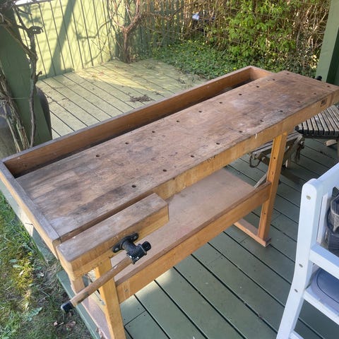 Solidt træ arbejdsbord/høvlbænk med to skruetvinger i siderne. Har hulrække i bordpladen og en åben opbevaringsbakke i den ene ende.trænger til en kærlig hånd. Det er et børne bord.