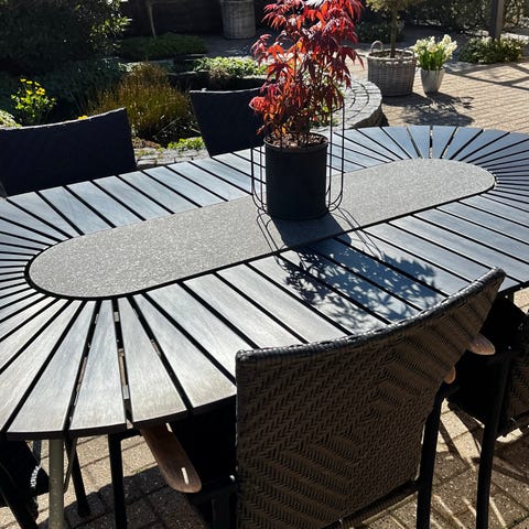 Eclipse havebord, sort polywood, granit i midten og stel i stålgrå metalstel, mål: 200 X 110 X 74 CM (Link: https://ilva.dk/havemoebler/haveborde/eclipse/sort-polywood/p-1013098-5637402703/)