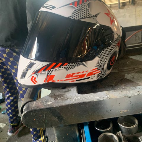 børnehjelm LS2 integralhjelm i str M, hvid med røde og sorte detaljer. Har klart visir, ventilation foroven og blødt indtræk indeni.