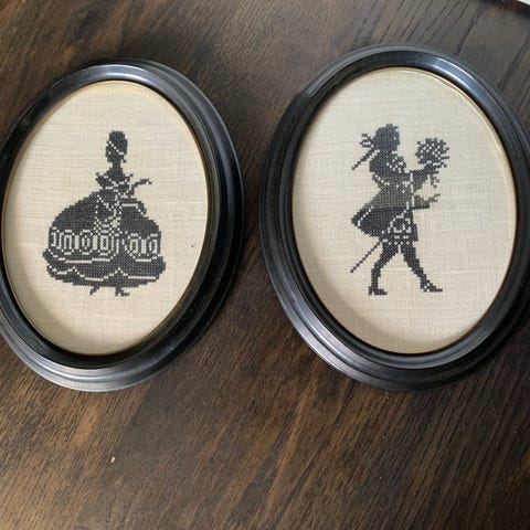 Fine broderier i sorte ovale rammer med motiver af damer og herre i gammeldags tøj. Sælges samlet som sæt til vægdekoration. Samlet pris 150kr