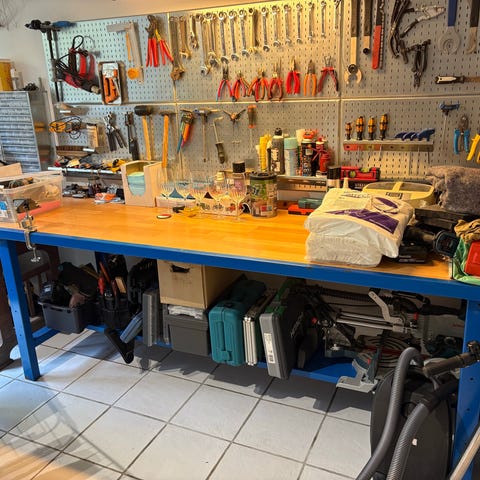 Værkstedsbord i meget fin stand (trods spraymaling rester på låge)