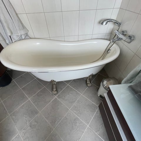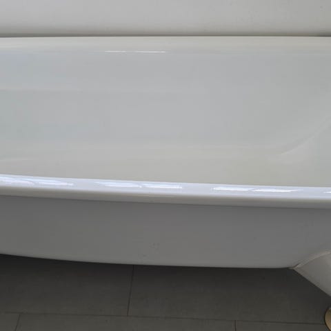 Fritstående hvidt badekar i akryl med ovale kanter. Mål: 169x60x78 (bredde/højde/dybde) Inklusiv Hansgrohe blandingsbatteri med håndbruser.