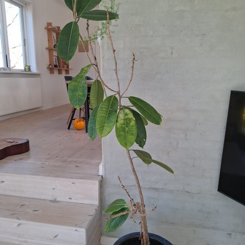 Stor stueplante / klatreplante i potte med støtte, så den vokser opad. Har mange grønne hjerteformede blade med lidt lysere aftegninger flere steder.