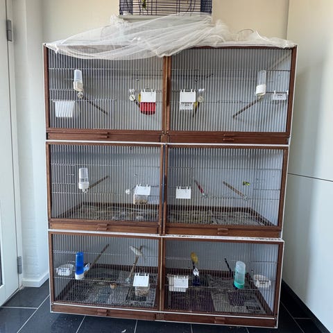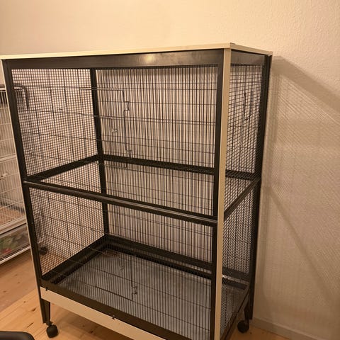 Stort sort fuglebur med buet top og stor frontlåge. Har bundbakke, siddepinne og flere mindre låger i siderne.