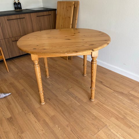 Vintage spisebordssæt med rundt/ovalt spisebord og 4 stole. Købt i 1998. Brugt, men solidt og har mange gode år i sig endnu.