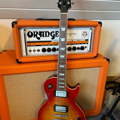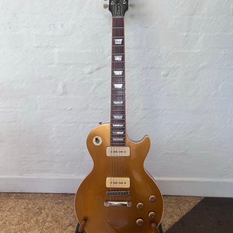 Opgraderet af tidl ejere hele vejen rundt med Gibson PU's, roller bridge, locking tuners, push/push tonepots til coil split på begge pickupper.. Så en alsidig og iøjnefaldende guitar. Fuldt på højde med "storebror"