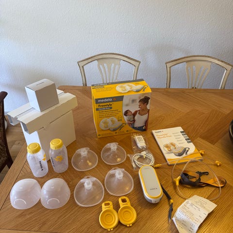 Medela Freestyle elektrisk brystpumpe med slanger, tragte og brystskjolde. Har oplader, clips og flere små dele som ses på billedet.